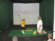 you would outdoors. You drive, chip, or putt real golf balls with your own clubs into